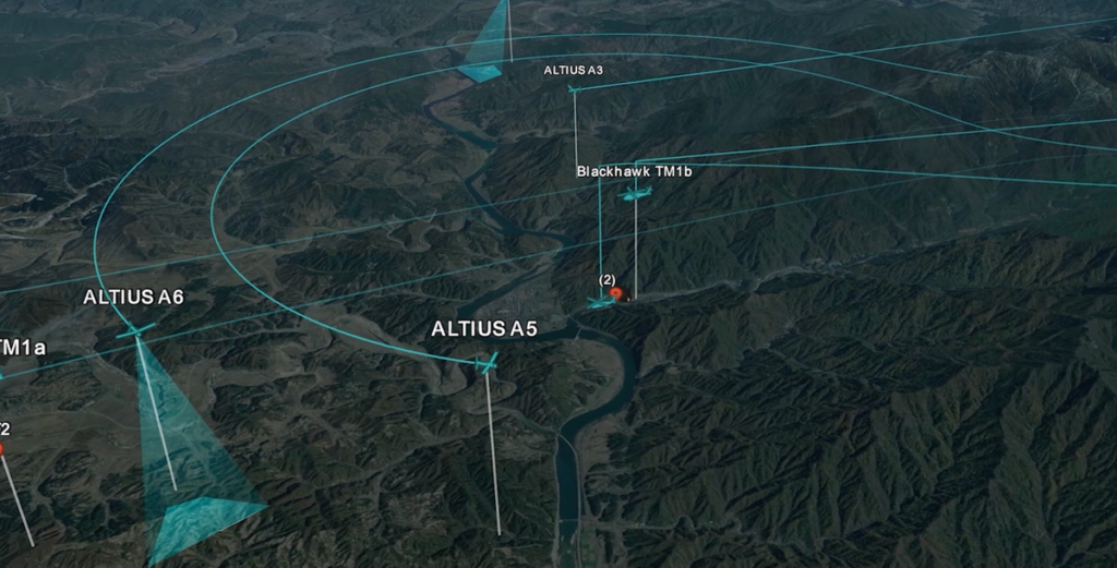 Virš šio tiesioginio 3D žemėlapio bus 1080p virtualus ekranas, didesnis nei prie sienos pritvirtintas 70 colių televizorius, rodantis tiesioginį sprogmenų supakuoto žemo aukščio nuotoliniu būdu valdomo drono, besiartinančio prie antžeminių taikinių, vaizdą. .